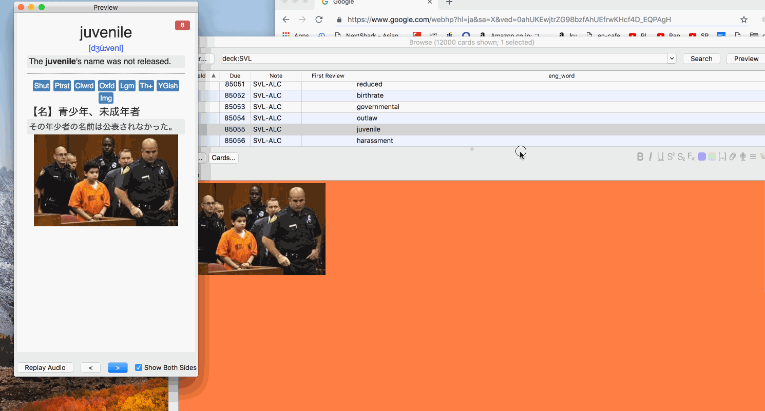 This add-on is basically for my own benefits, so I will explain some background. Remembering completely vocabulary is always difficult. To aid to create some clue in my brain, I found associating an image with the vocabulary is really efficient. So I started associating images with each word in my decks which have 12000 vocabularies. Then I noticed