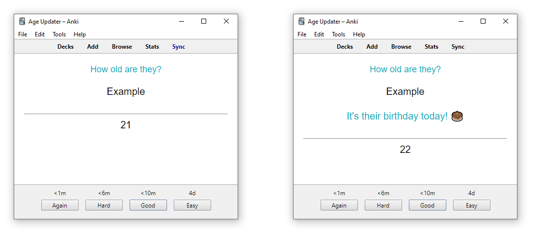 This plugin allows you to remember the age of your friends and acquaintances in Anki. You will have a card displaying the persons name and asking for their age.