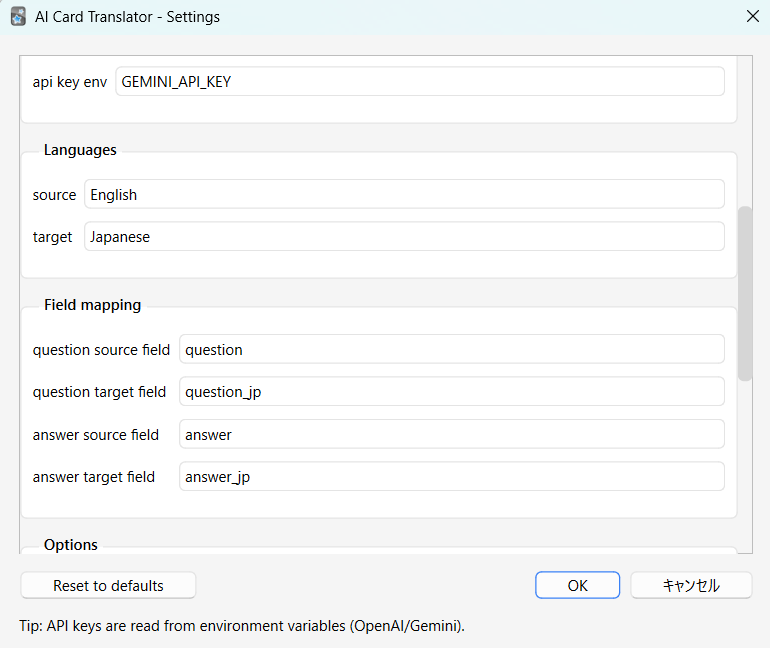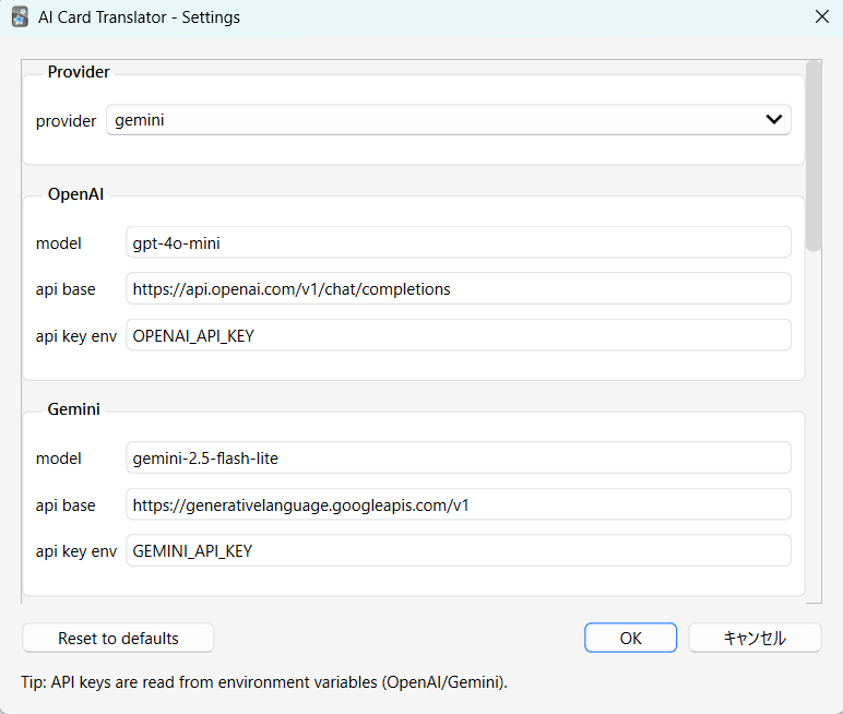 macOS Run the following command in Terminal: launchctl setenv OPENAI_API_KEY your_api_key_here or for Gemini: launchctl setenv GEMINI_API_KEY your_api_key_here Restart Anki after setting the variable.