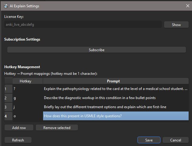 ✨ Key Features One-key AI explanations while reviewing Explanations are saved to a dedicated note field (persistent) Custom prompts per hotkey (e.g. explain, give mnemonics, compare concepts) On-the-fly prompts for when prewritten prompts aren’t enough Collapsible explanation panel to keep cards clean Designed for large decks and common templates (e.g. AnKing) Mobile-friendly: previously generated explanations are visible on AnkiMobile and AnkiDroid during review 💳 Subscription & Usage