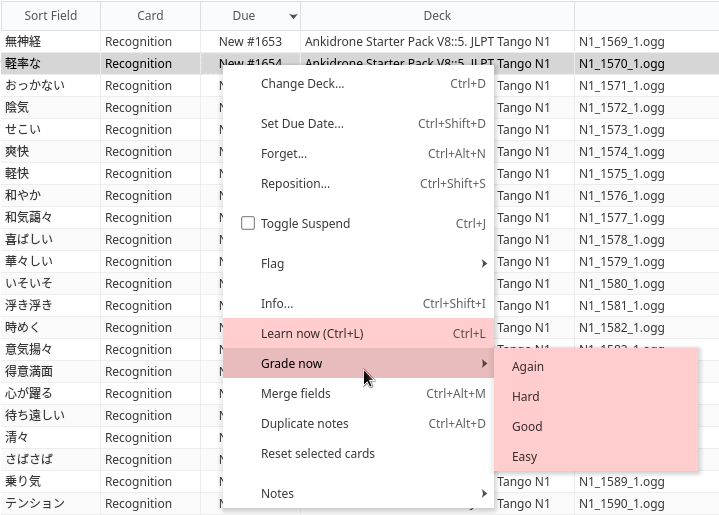 AJT Card Management (trước đây là Learn now & Grade now) là một addon Anki cực kỳ hữu ích giúp bổ sung các nút quản lý trực tiếp vào cửa sổ trình duyệt thẻ (Card Browser). Bạn không cần mở chế độ xem (Reviewer) mà vẫn có thể lập lịch học, chấm điểm và cài đặt lại dữ liệu của thẻ vô cùng dễ dàng.
