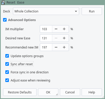 A useful add-on, but why does it not let to put ease at 130% and IM at 192%? Those are the intervals which recommended in https://refold.la/roadmap/stage-1/a/anki-setup Comment from author If a user sets Starting Ease to 130%, it always gets reset back to 250% after a force sync. So by setting Starting Ease to 131% you can avoid the bug.