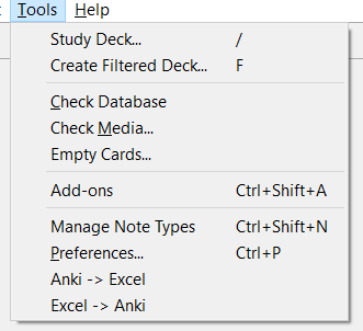 Note: Currently does not work with Anki v2.1.25+. Supports only .xlsx files. (Microsoft Excel file) Notes cannot have more than two tags with selected super-tag. (Super-tag is the top-most level of hierarchical tags. Super-tag of tag science::physics::var would be science) If there are formulas in excel files, the formula itself will be seen as values, not computed values. Images put directly into excel files will not be loaded into Anki. Use Anki to put images inside notes. If you delete, rename, or modify a note type, Excel -> Anki will not work until Anki -> Excel runs. Import your edited excel files before changing note type. If you find any bugs, please report them here instead of in the comments. I do not get any notification from the comments. Alternatively, you could message me on reddit u/bluegreenmagick.
