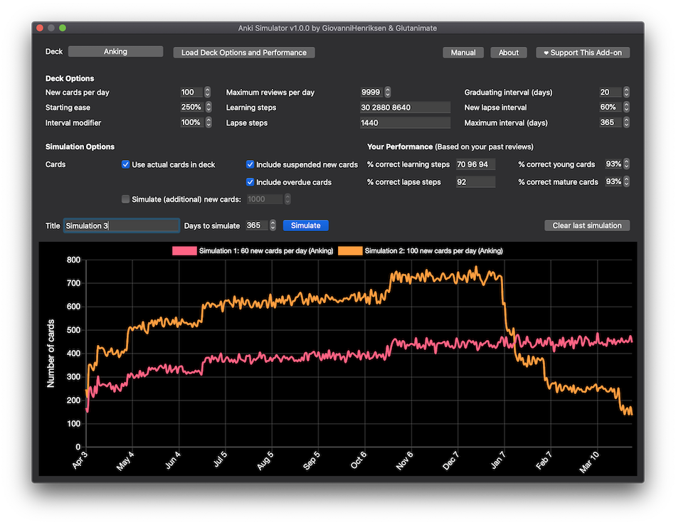 How accurate is it? Anki Simulator was carefully written to closely match Anki’s scheduling algorithm. Because the add-on uses your actual cards, deck options and statistics, Anki Simulator is able to produce a personalized simulation. If you provide accurate variables, the simulator should do a good job of giving you a rough idea of your future workload. Obviously however, long-term outcomes rely on many factors that can’t be implemented in an add-on. The add-on takes some assumptions that may not be applicable in your situation: It does not take into account pressing the ‘hard’ or ‘easy’ buttons. The simulator assumes that excluding them both should balance their effects out for a large part. (Also see: ‘Performance rates’ in the add-on manual) It assumes that your retention rates are correct and will not change in the future, and are the same for every single card of a certain type (learning, lapse, young, mature), regardless of individual difficulty. It assumes that no days are skipped.