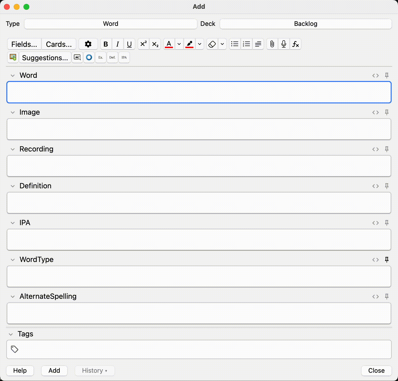 Usage Open Anki and navigate to the card editor Type your word/phrase in the front field Use the toolbar buttons or keyboard shortcuts: Ctrl+Shift+1: Add images Ctrl+Shift+2: Add pronunciation Ctrl+Shift+3: Add example sentences Ctrl+Shift+4: Add definition Ctrl+Shift+5: Add IPA Configuration Tools → Add-ons → Anki² → Config Configure your API keys: { “bing_api_key”: “your-bing-api-key”, “forvo_api_key”: “your-forvo-api-key”, “openai_api_key”: “your-openai-api-key” }