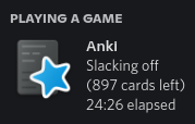 Works pretty well, and has some nice customization available. Constantly throws errors if Discord is closed while Anki is open though. Comment from author I can’t seem to reproduce this. If you’d like me to take a look at the problem, please consider making a GitHub issue with some more info