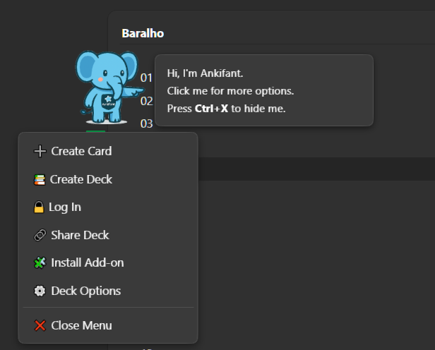 This add-on adds a virtual helper, the elephant Ankifant, to all of Anki’s key screens. It was created to teach beginners how to use the program easily and intuitively.