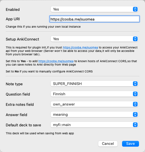 Plugin is disabled by default, so you need to enable it You can enable auto setup of AnkiConnect Installs plugin Adds configured App URI to CORS list