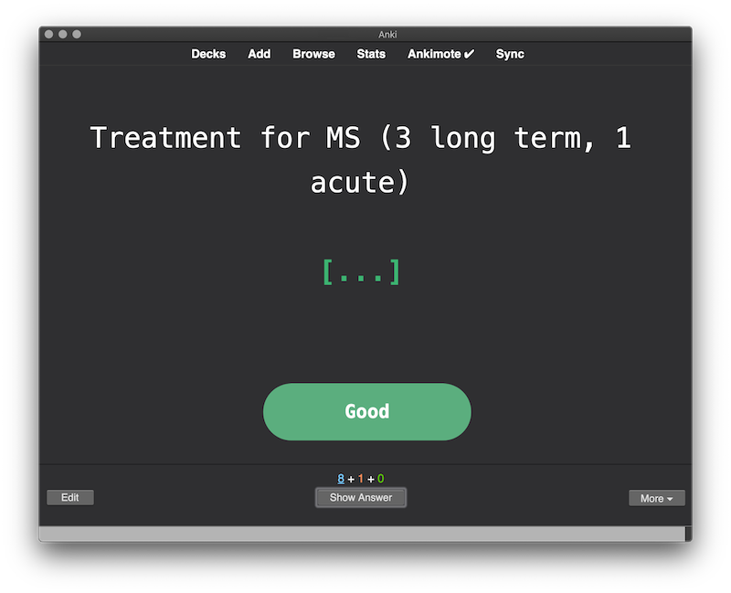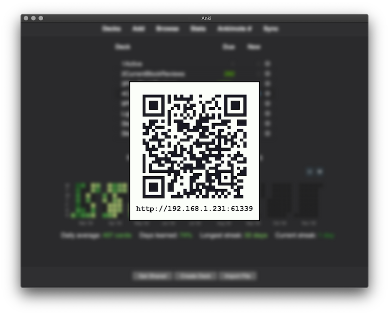 Ankimote is an addon that adds remote control functionality to Anki. After installing this addon, selecting ‘Ankimote’ from the Anki toolbar will start Ankimote and display a QR code and URL directing to the remote that can be accessed by any other device on the local network (usually your phone). Best used with the Anki Zoom addon to make card text bigger. Then place your laptop far away (or plug into an external monitor or TV) and put your feet up!