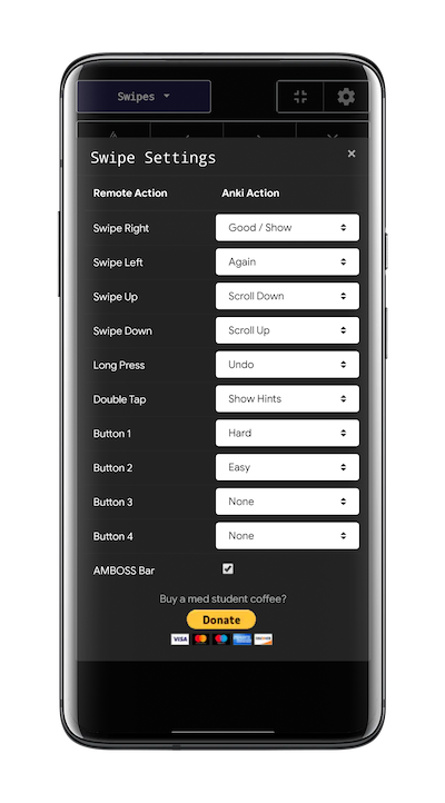 FEATURES Answer cards (again, hard, good, easy) from the remote and get visual feedback on the desktop app Scroll up, scroll down, undo from the remote One-hand (Swipes) and two-hand (Taps) control interfaces Switch decks without touching your computer Works with the AMBOSS addon to flip through popups ‘Show Hints’ action reveals hidden portions of cards in common decks such as Anking and Pepper Advanced features (see addon config in Anki): Custom actions to trigger execution of user-defined Python code (to interact with Anki) or Javascript (to interact with the current card) Custom hook support for integration with other addons LIMITATIONS/TROUBLESHOOTING Both devices must be on the same network (usually the same WiFi name), and the network must allow local communication (public networks like coffee shops and some schools may not work) Workaround (if you know some networking): when the above conditions cannot be met, try enabling Bluetooth tethering on your phone and connect your computer to your phone’s Bluetooth. In your computer’s Bluetooth settings, use “connect to network” or similar to create an internet connection over Bluetooth between the two devices. Then find your computer’s IP address on the Bluetooth connection, and use that IP address instead of the one Ankimote displays. Use the same port displayed by Ankimote. If the page never loads on your phone, make sure you have allowed Anki firewall access on both public and private networks. VPN must be off on both phone and computer. If you experience bugs after updating this addon, clear browser cache on your phone, as browsers will sometimes use a cached older versions of web page components Problems with AMBOSS? Try updating to the 7/26/21 or later version found here. May be incompatible with some addons that modify the answer buttons (with the latest update, it should work with Button Colors and Auto Ease Factor).