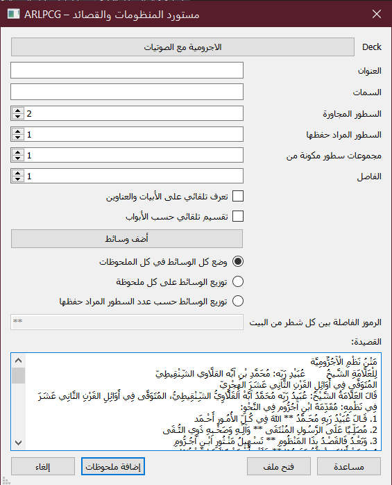 مستورد المنظومات والقصائد (ARLPCG) هي إضافة لتسهيل استيراد النصوص الطويلة، مثل المنظومات والقصائد.