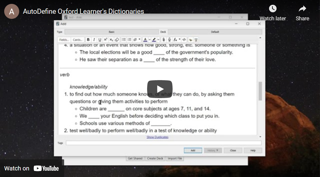Auto-fetches Oxford Learner’s Dictionaries data (definition, usage examples, phonetics, audio, irregular verb forms, and optional image search links) with no API key required—just click the AutoDefine button in the Add dialog or editor. It’s strictly English-to-English, which helps intermediate/advanced learners progress faster. Ships with a ready-to-use “AutoDefineOxfordLearnersDictionary” note type and can also map to your custom fields, so setup takes seconds whether you use the default or your own layout. Removes the study word from the reverse card examples while keeping a hint for the first letters, encouraging active recall before revealing the answer. Supports “Define in bulk” directly from the Browse window, letting you queue dozens of notes and populate them in one run.