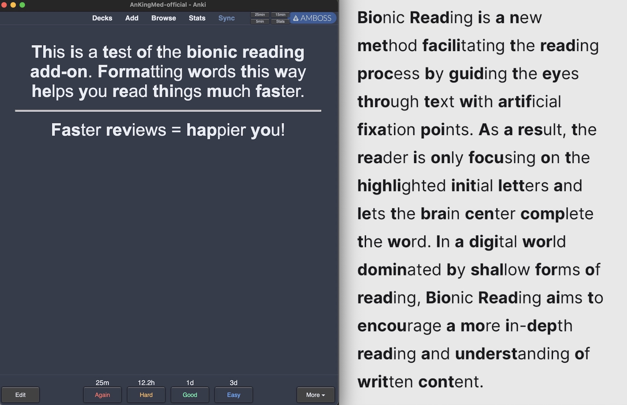 This add-on adds Bionic Reading formatting to your Anki cards! Bionic reading bolds the beginning half of each word which makes reading faster. It works on your mobile Anki version, as well! See the image posted below and check out https://bionic-reading.com/ for details!