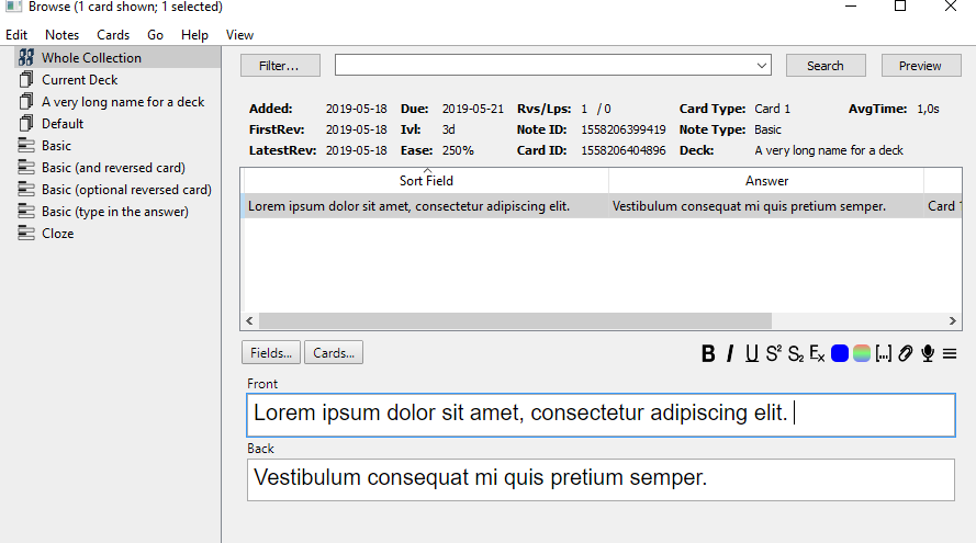 2022-01-26 different menuView detection for better compatibility with other add-ons 2022-01-19 first fix for Anki 2.1.45+ 2020-11-03 make the date() function more robust. This may or may not fix issue #5. 2020-08-01 (optionally) add background colors if suspended or many lapses which might be useful if you have hidden the table with Browser Maximize/Hide Table/Editor; in 2.1.28+ use col.format_time_span() instead of col.backend.format_time_span() 2020-07-07 option to move the deck into an extra line (in the default wide view), disabled by default 2020-07-03 better compatibility with other add-ons that use the “View” menu 2020-07-02 better adjust width, word wrap 2020-05-05 update for 2.1.24+: “named arguments in queries will go away in the future” 2020-04-16 fix for 2.1.22 or later: fmtTimeSpan() has become col.backend.format_time_span() 2019-12-22/25 better compatibility with Browser side-by-side (horizontal split). 2019-05-25 bug fixed (thanks @ lovac42) 2019-05-19 initial release