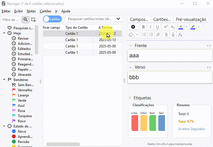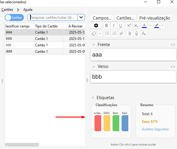 Este addon adiciona um painel ao editor do Anki que exibe estatísticas detalhadas de uma carta, como o número de vezes que foi classificada como “De Novo”, “Difícil”, “Bom” ou “Fácil”, além do total de revisões, taxa de acertos e sequência de acertos consecutivos. Para mostrar ou ocultar as estatisticas use o atalho: Ctrl+Alt+x Ele é bom para ver no browser como esta a situação de cada card.