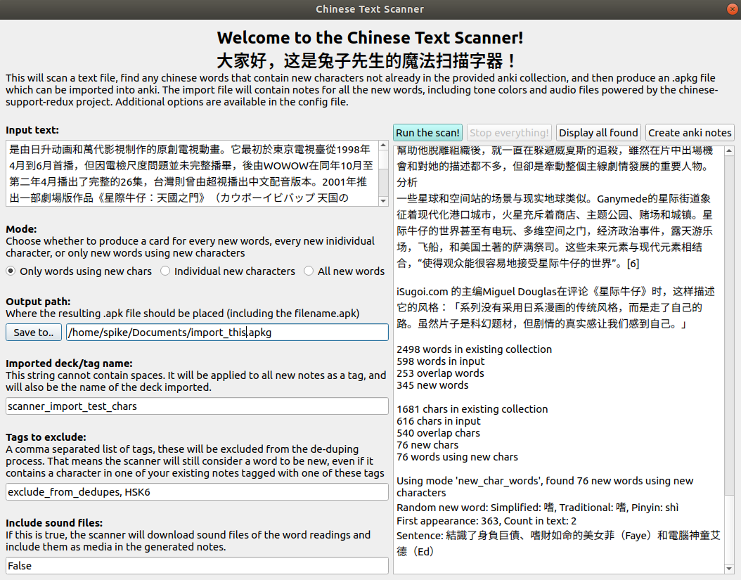 This will scan a text file, find any chinese words not already in the provided anki collection, and then add them as notes to your Anki collection. The notes include tone colors and audio files powered by the chinese-support-redux project. You can configure which note type to use if you want to use your existing card templates, or you can take the default note type provided. You can also choose whether to add all words found, or only words containing new characters.