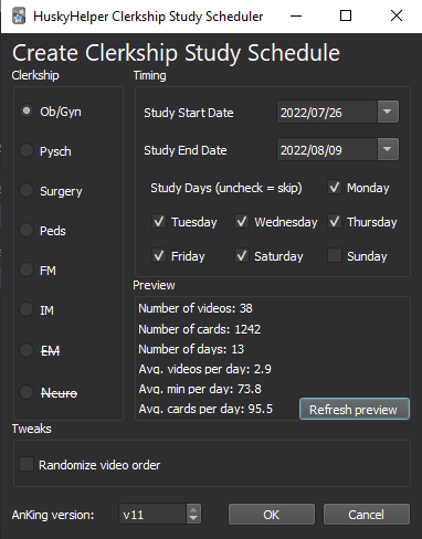 Please feel free to email me with feedback / any errors - I’d appreciate if you reach out here before leaving a negative review if there’s ever an issue. Keep in mind this is very much a rudimentary, hacked-together, labor of love! Would love to hear suggestions on features that would make this a more useful tool for you. Currently working on adding more customization to the schedule creation and mild gamification changes. Reach me at: ankihuskyhelper@gmail.com