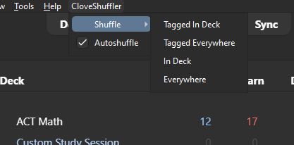 Functionality Custom tag interfacing Manual Shuffling Shuffle all cards in the current deck with the “shuffle” tag Shuffle all cards with the “shuffle” tag Shuffle all cards in the current deck Shuffle all cards Autoshuffling When reviewing, the shuffler will automatically shuffle using a specified method. This method can be changed using the config. Usage Custom Menu Button
