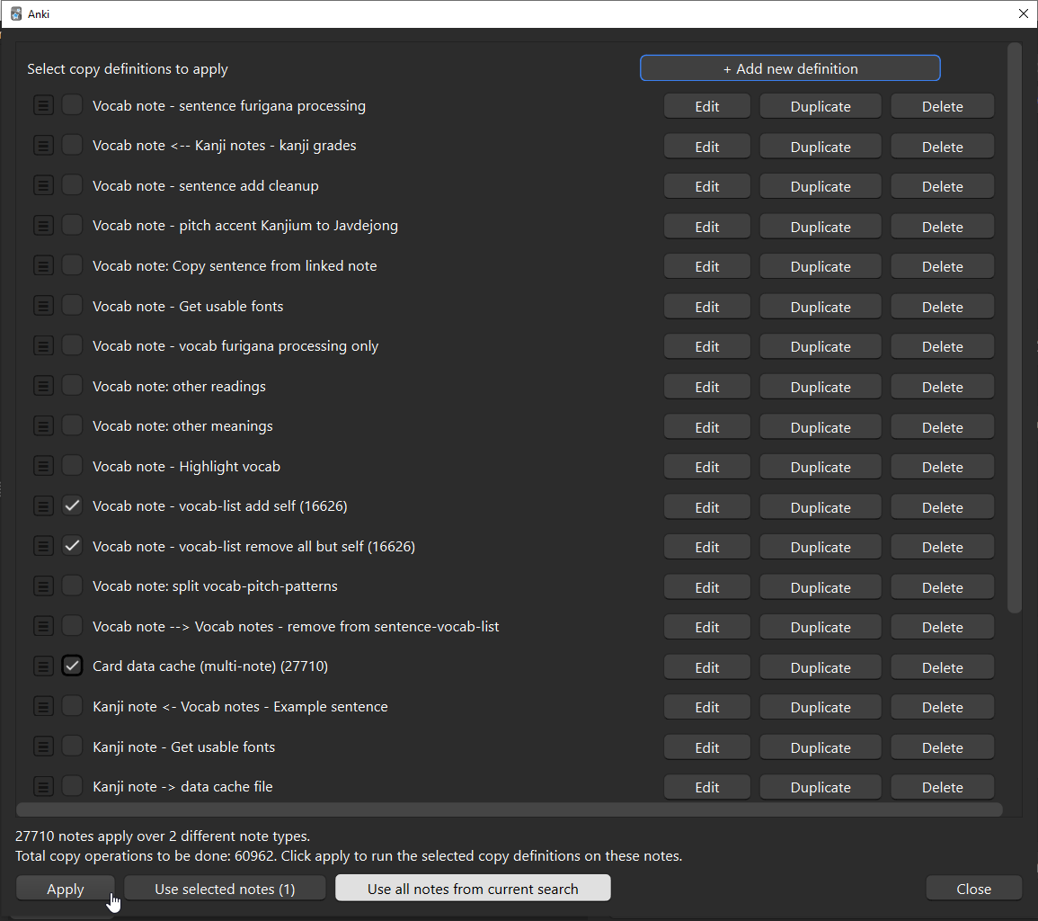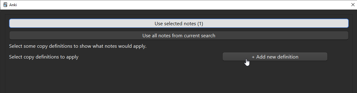 The dialog additionally allows running copy definitions for the selected notes in the browser, or the entire search result. This is useful for running multiple definitions at once for a selection of notes. Otherwise, to run a single definition for a selection of notes in the browser, you can use the right-click menu.
