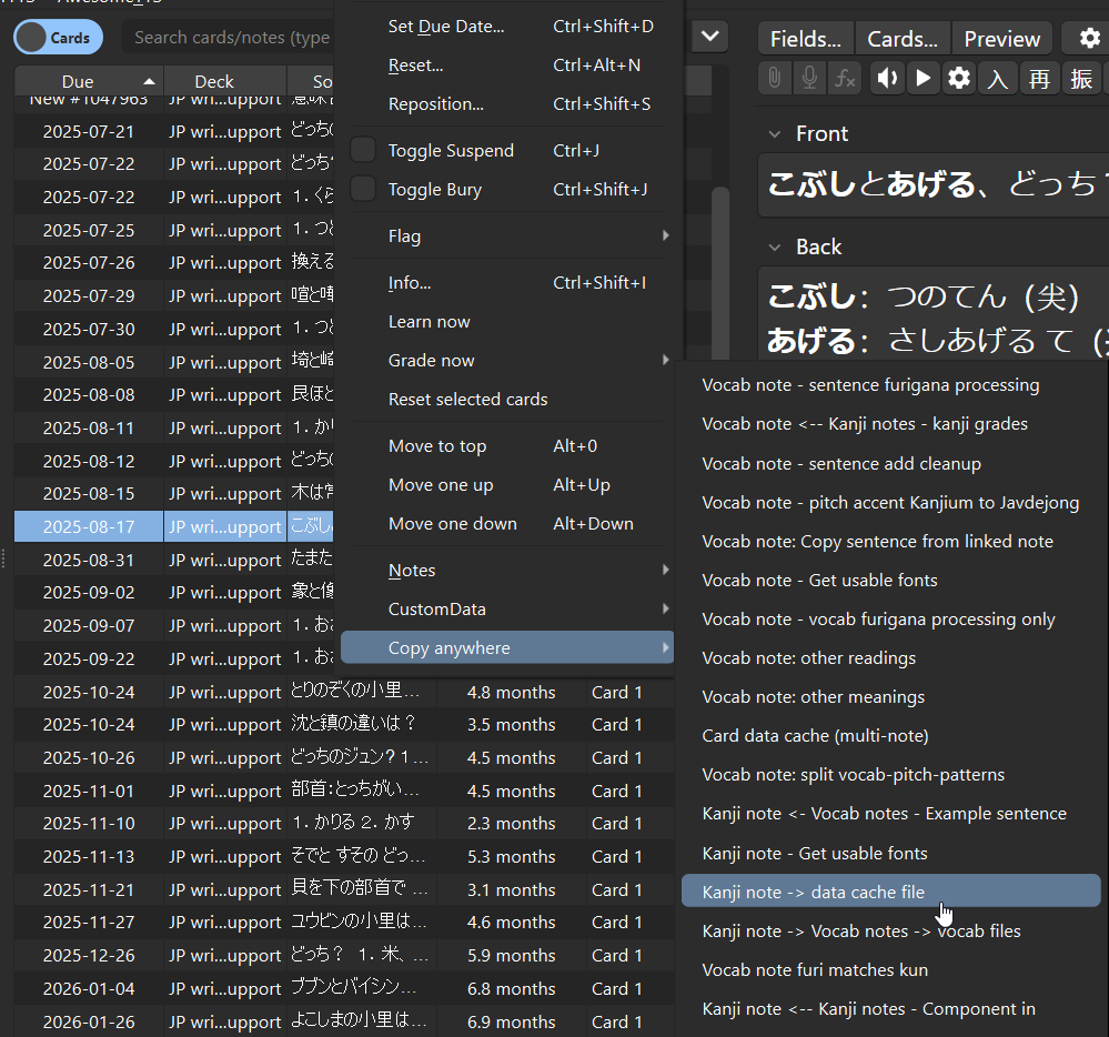 Changelog 23.7.2025 Fixed bug with cursor jumping whenever the definition is edited. Moved selection toggles and text to main dialog footer for easier access when the dialog is long enough to need scrolling. 14.7.2025 Fixed error with adding Regex replaces. Fixed weird spacing in main dialog 11.7.2025 Big update with lots of incremental changes, bugfixes and new features: UI updated to use lazy loaded tabs for each main section Unfocus trigger can by any field Variables for within note mode Drag-n-drop reordering definitions Regex can be interpolated too Fancier progress dialog Logging level can be changed to debug from error using config Fixed swapping fields not being possible. Every field edit uses the same initial field values; editing a field in one operation and sourcing it next doesn’t cause weird behaviour. Lots of work on kana highlight process: preserving kana, handling roman numbers, kanji target not required, bugfixes, more kanji data, jukujikun handling 17.12.2024 Bugfixes so far. Fixed variables not working when used in field content. Fixed fc=1 flag not set into custom_data when reviewing 15.12.2024 Now you can copy from destinations to sources and vice versa. Added a highlighting required fields in red and more styling.
