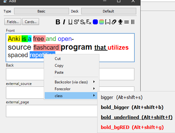 This add-on offers more styling options for the Anki editor: You can quickly set different font colors, background colors, font sizes or apply custom classes or styles. You can use shortcuts, buttons from the top of the editor or the context menu.