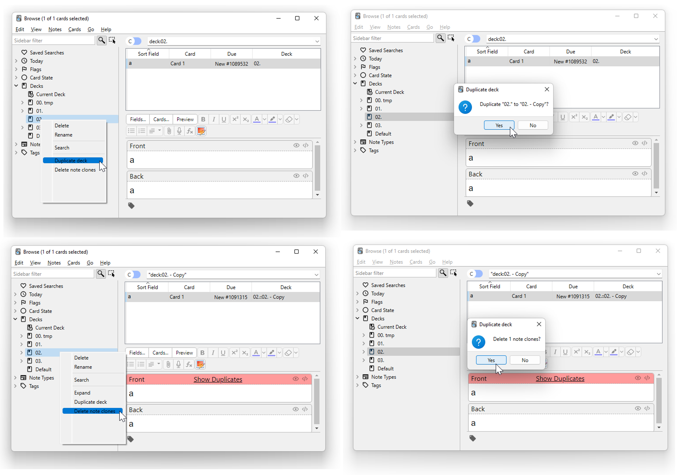 great! I got to duplicate the deck without the error that deletes any double cards in other decks!