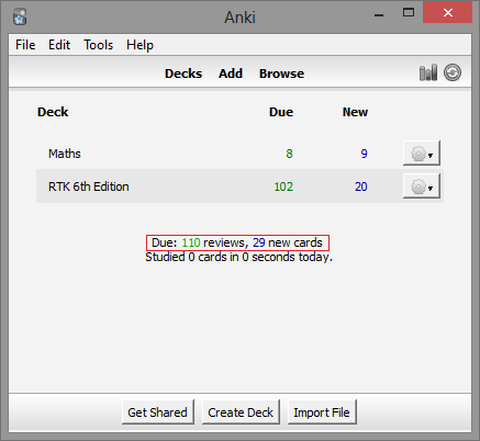This add-on shows the total due and new cards from all the decks in the deck browser. It’s just like anki 1.2.8 except that this add-on places the total stats above the studied stats.