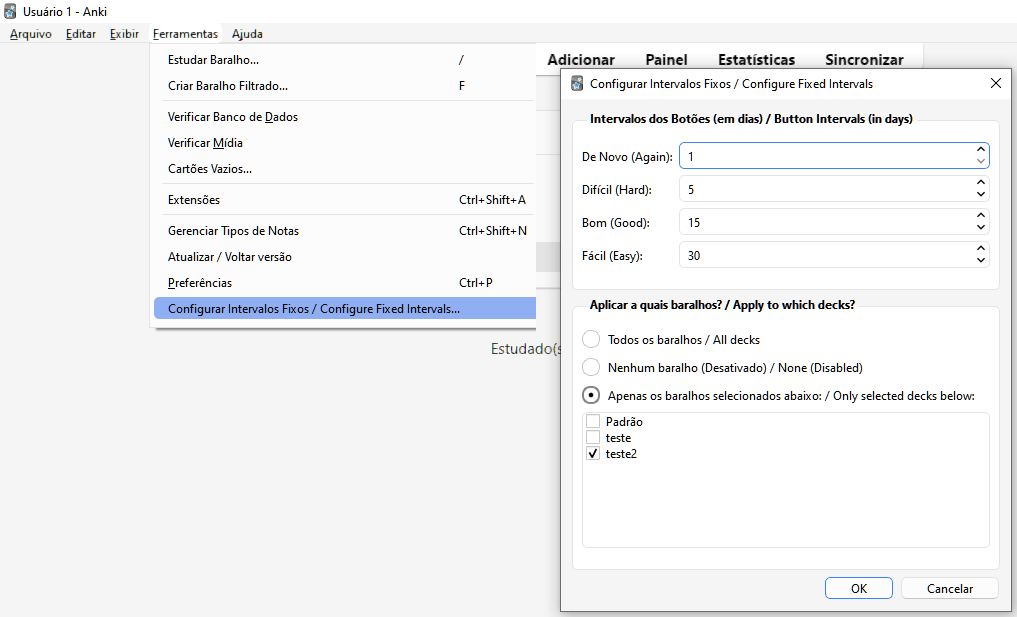 Este add-on substitui o algoritmo de agendamento padrão do Anki por intervalos de revisão fixos e personalizáveis. Você pode definir exatamente quantos dias um card levará para reaparecer ao clicar em “De Novo”, “Difícil”, “Bom” ou “Fácil”. Para evitar confusão, ele também oculta os intervalos de tempo originais do Anki que aparecem acima dos botões, mostrando apenas os seus valores personalizados. Além disso, permite aplicar essas regras a todos os baralhos, a nenhum, ou apenas a baralhos específicos que você escolher.