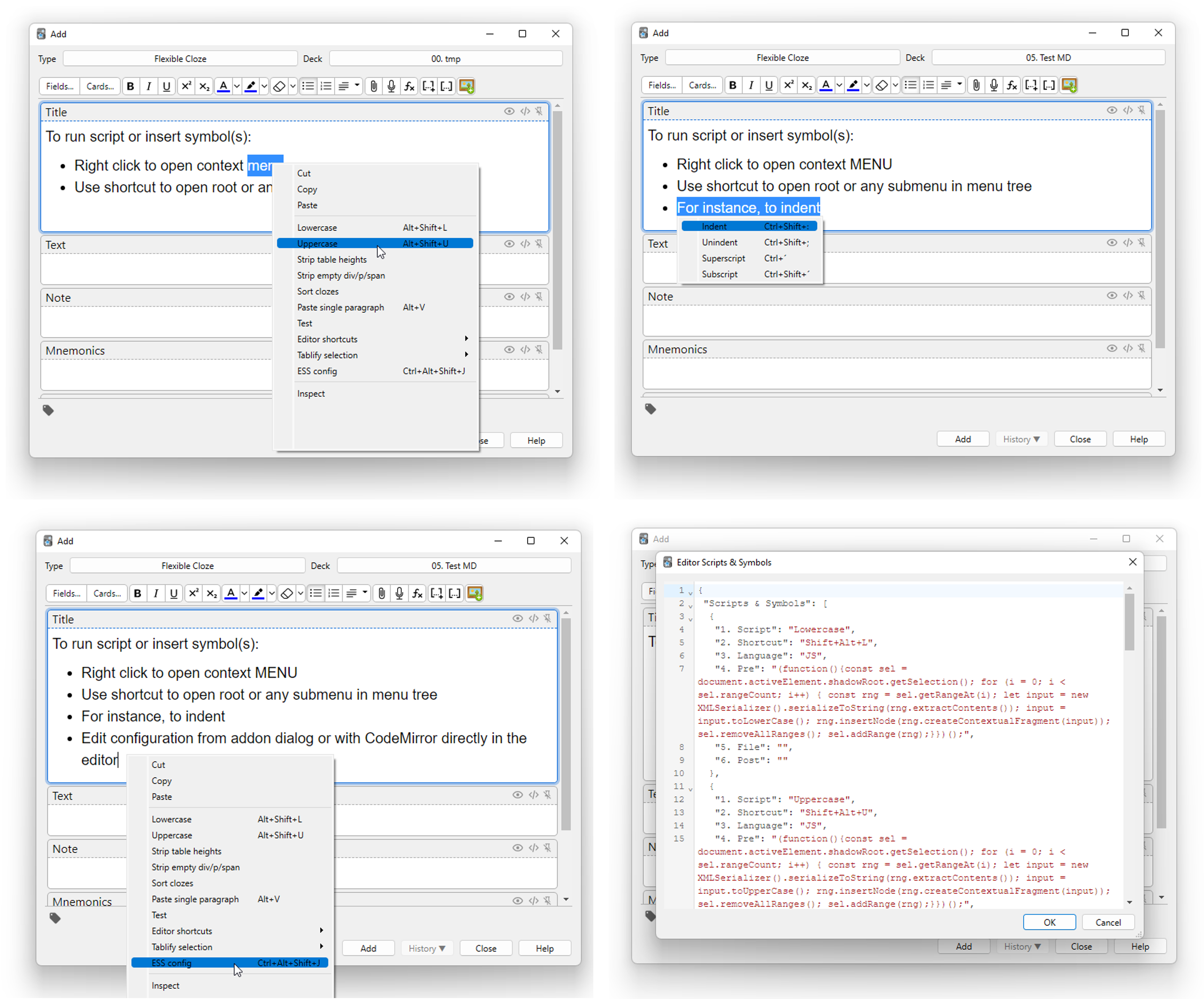 General configuration Addon configuration of scripts and symbols to run/insert is made in the addon configuration. To speed up and facilitate editing of configured scripts and symbols a CodeMirror 6 editor with JSON syntax highlighting is available from the context menu from the editor fields. Alternatively you can use the built in Anki addon configuration editor available from the Tools → Addons → Configure addon menu. The ESS editor has the following key board shortcuts: