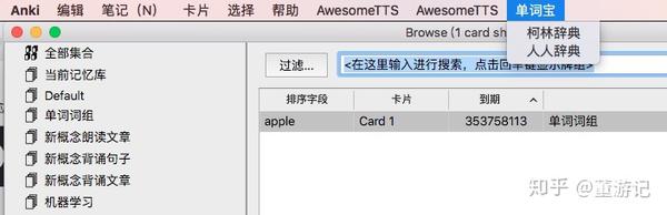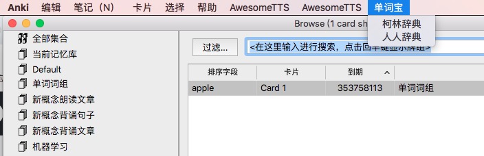 The Usage: Add a new word using the Basic Type, then, go to the Browse and find the word you have just added, double click the word and click the menu bar “单词宝”, then choose a dictionary and click, and a complete card will be produced.