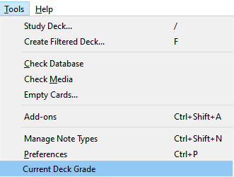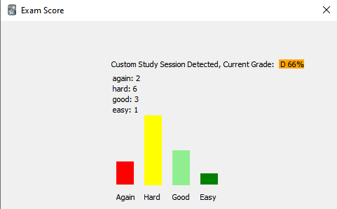 An addon that adds a window under the tools menu to grade your custom study session to give you an idea of your standing like a test would. (*only an estimate)