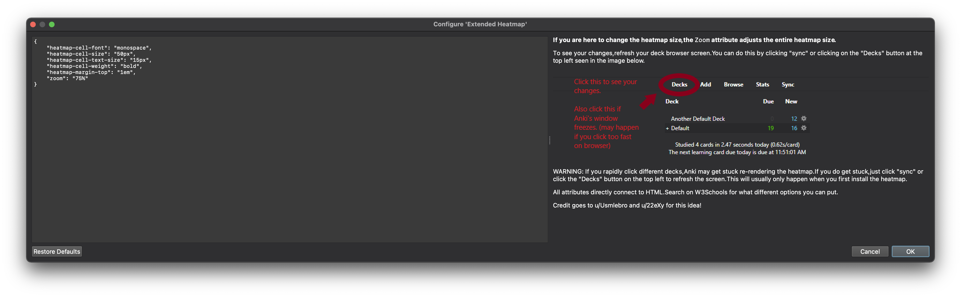 NEW CONFIG Due to requests from the Anki subreddit [I didn’t know people actually used my addon :’) ], there is now an ability to config the heatmap size in the addon. In addition, there is a quick tutorial to explain how to escape the occasional freezing of the deck browser when clicking different decks too fast.