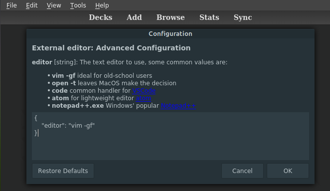 Updates: 2022-05-17: Added config option for file extension of the temporary file created when editing note contents 2022-04-25: Adjusted default shortcut for mac, add more information on setup in config 2022-02-06: Added compatibility with Anki 2.1.28 2022-01-28: Changed how editors can be configured 2021-11-5: File editor launch commands can now be specified as a list to allow white space in arguments (e.g. [“command”, “arg1”, “arg with spaces”]). (Contribution by github user jack-faller.) 2021-9-22: Initial Release (Update for Anki 2.1.45)