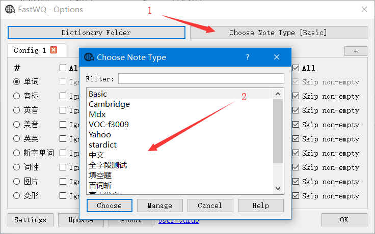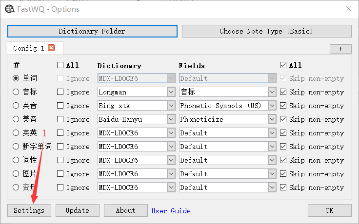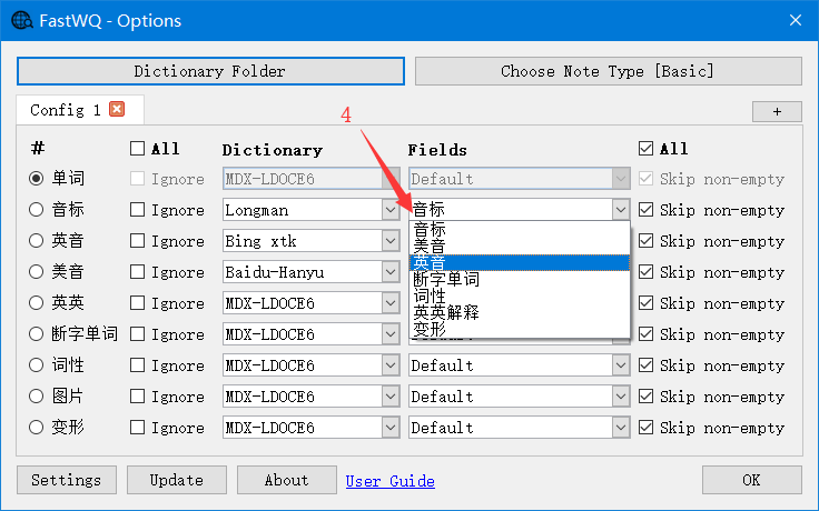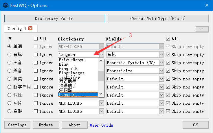 Set the query fields Click menu “Tools -> FastWQ”, or in Browser window click menu “FastWQ -> Options” Select note type Select Dictionary Select Fields Click OK button