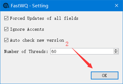 In Browser window click menu “FastWQ -> Options” Click Settings button in the Options window Force Updates of all fields : Update all fields even if it’s None Ignore Accents : Ignore accents symbol of word in querying Auto check new version : Check new version at startup Number of Threads : The number of threads running at the same time