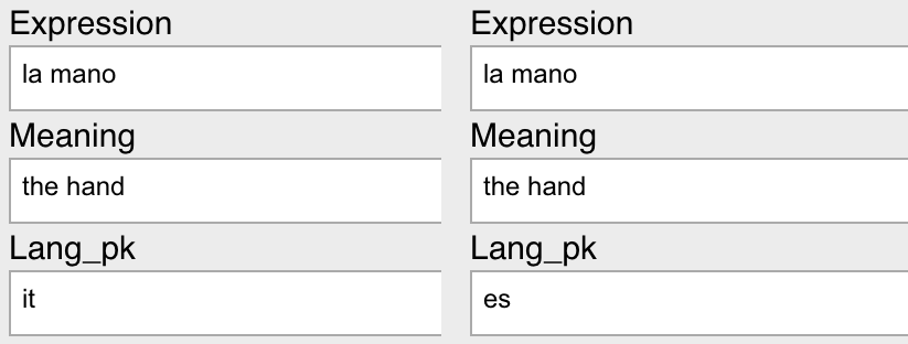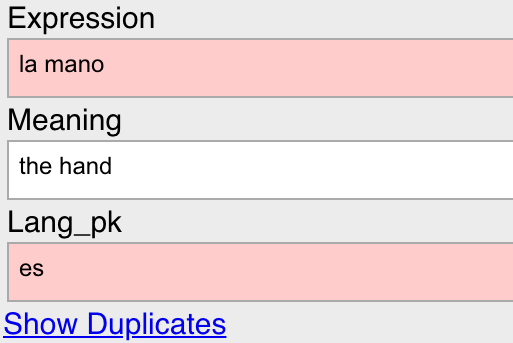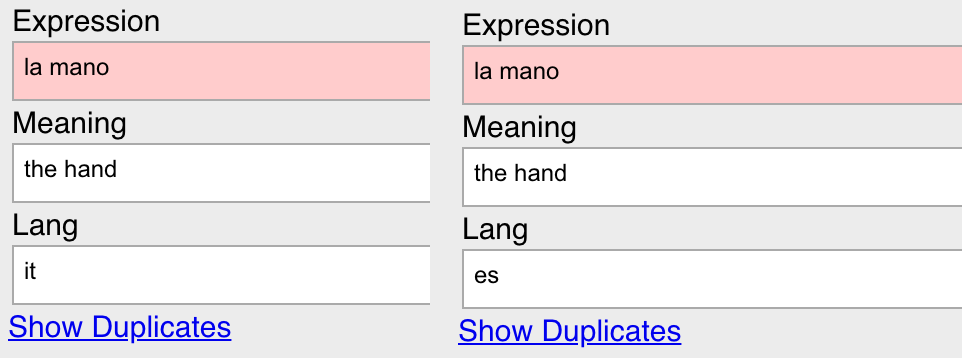 Append _pk to the name of any fields besides the first field that you want to be considered in duplicate detection. For a note to be a duplicate, the first field and all other fields ending in _pk must match. For example, below the primary key for detecting duplicates is (Expression, Lang_pk). While the Expression matches, Lang_pk does not.