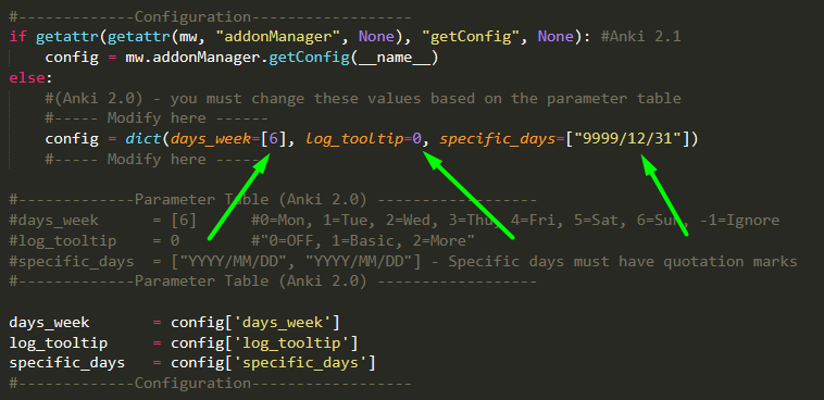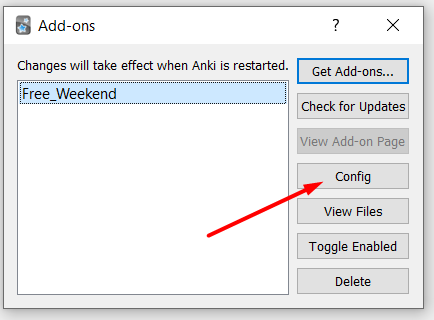 Anki 2.0 Open the free_weekend.py file in the add-ons folder and change the parameters