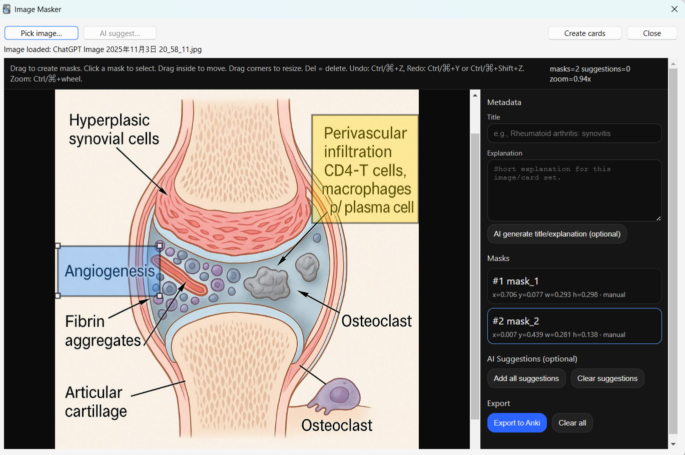 Turn images into powerful active-recall cards — without fighting the editor. Draw masks freely, edit them anytime, and optionally let AI suggest what to hide. Built for anatomy, diagrams, and anyone who studies visually.