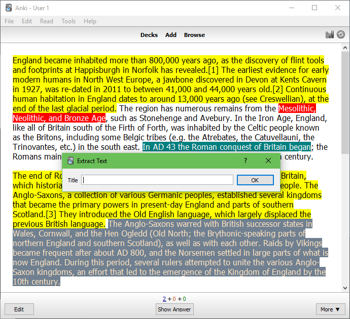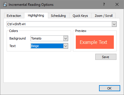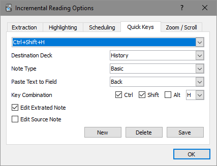 Remove unwanted text with a single key-press (z) Multi-level undo, for reverting text changes (u) New options to control how text is extracted: Open the full note editor for each extraction (slow), or simply a title entry box (fast) Extract selected text as HTML (retain color and formatting) or plain text (remove all formatting) Choose a destination deck for extracts New options for several aspects of zoom and scroll functionality: Zoom Step (the amount that magnification changes when zooming in or out) General Zoom (the zoom level for the deck browser and overview screens) Line Step (the amount the page moves up or down when the Up or Down direction keys are used) Page Step (same as above, but with the Page Up and Page Down keys) Highlighting: Both the background color and text color used for highlighting can be customized A drop-down list of available colors is provided A preview is now displayed when selecting highlight colors The colors applied to text extracted with x can now be set independently Quick Keys A list of all existing Quick Keys is now shown, to allow easy modification Unwanted Quick Keys can be easily deleted A plain text extraction option has also been added All options have been consolidated into a single tabbed dialog