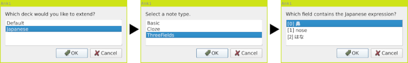 ② Choose a deck ③ Select a note type (is skipped if whole deck is one note type) ④ Select the field containing the Japanese expression