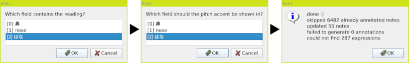—————<[ C H A N G E L O G ]>————— 2023/05/07 — Added function to automatically set single pitch. Made add-on Qt6 compatible. Various stability, performance and UI improvements. 2022/03/26 — Fixed bugs concerning functionality to manually add/edit/remove annotations. (Thanks kclisp) 2022/01/23 — Updated pitch accent DB (from roughly 100k to 200k entries). 2021/08/22 — Added cancel buttons to selection dialogs. 2021/01/26 — Added support for successive bulk adding of annotations to different fields of notes. 2020/10/05 — Added functionality to manually add/edit/remove annotations. 2020/08/02 — Made code compatible with new Anki 2.1.29 DB schema. 2019/09/22 — Added support for multiple note types within a single deck.