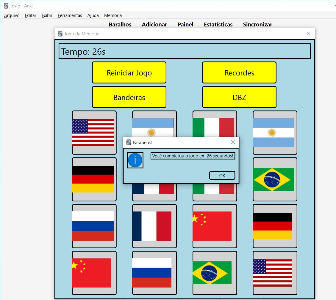 Integração com os cards do Anki: O usuário pode transformar qualquer jogo criado em um card do Anki. Ao revisar este card, o jogo da memória aparecerá diretamente na tela de revisão, tornando o estudo mais interativo e lúdico.