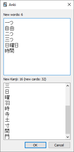 Selecting KanjiUnlockAddon: Unsuspend new kanji will take the newly learned vocabulary cards and check what kanji they contain. Those kanji will be unsuspended in the kanji deck. The tag ‘kanjiunsuspended’ will be added to those vocabulary cards.