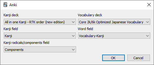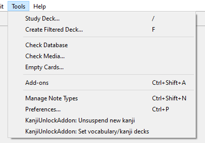 SETTING DECK/FIELD NAMES Before the add-on can work it needs to know which deck is the Vocabulary deck and which is the Kanji deck. These can be set with Tools > KanjiUnlockAddon: Set vocabulary/kanji decks.