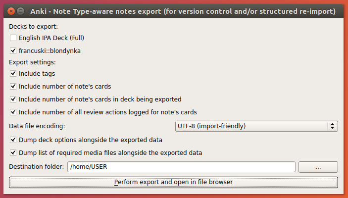 Maintenance: Note Type-aware export helps in keeping track of changes in deck options by optionally creating “deck-options.txt” file in every deck export directory. These options (like new card repetition pattern or “When answer is shown, replay both question and answer audio” setting and the like) are otherwise difficult to maintain.