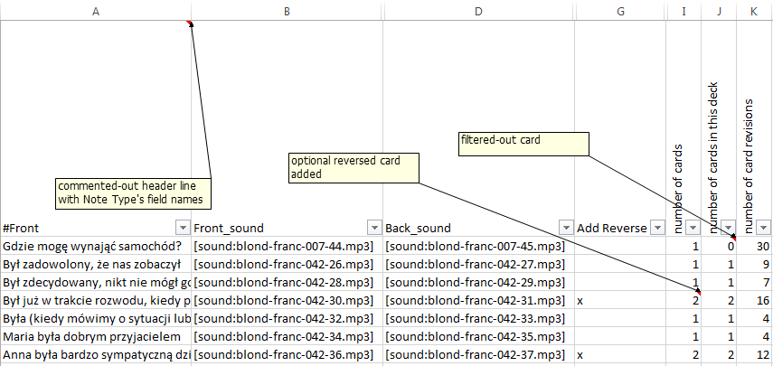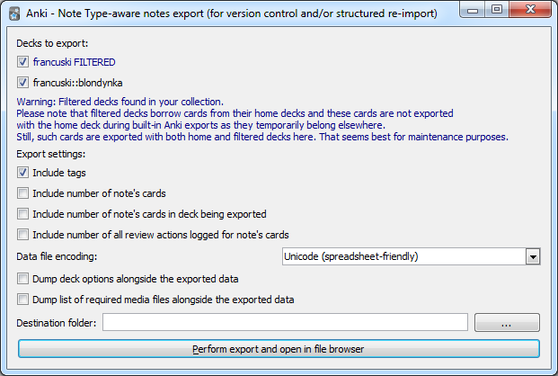 As Anki text import allows only UTF-8 encoded files as input, and UTF-8 is not handled well on doubleclick or “Open with” action by Excel, the plugin allows you to choose between these “re-import friendly” and “Excel friendly” formats. You may prefer one or the other depending on whether you want mostly to analyse the data or import it back. You should be able to easily re-save the data in other encoding using external tools if such need arises (even built-in standard, simple text editor should be able to do that). Note: you can open UTF-8 encoded file in Excel by using “File/Open” action and selecting the encoding from the list, but that’s just not what happens by default.