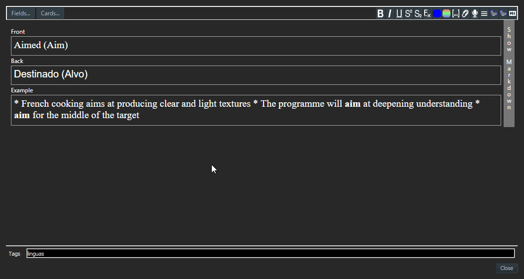 Mọi thao tác kĩ thuật chỉnh sửa thiết kế tạo dựng card bạn dĩ nhiên có thể gõ mộc chai bằng tay như văn bản thuần thô thông thường (plain text). Không cần bận tâm tới việc phải làm đẹp giao diện ở khung màn hình nhập rác này. Sau cùng khi nhấc bút ra ngoài khung cửa sổ mặt để thực thi ôn thẻ (Review), kho dữ liệu mới bắt đầu được phần mềm làm phép hô biến từ markdown phân giải thành mã hiển thị văn bản mang thiết kế xịn xò (Chuẩn HTML).