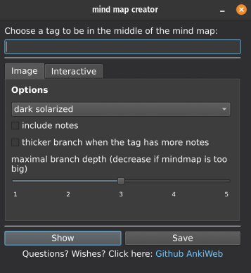 Usage Go to the Card Browser->Mindmap->Create mindmap This dialog will show up:
