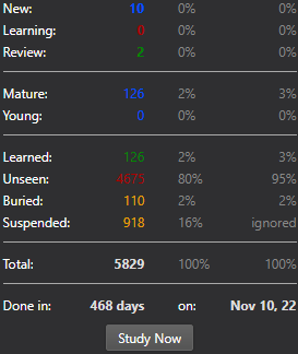 The first column shows how many cards belong to each respective category. (i.e., 711 unseen and 223 suspended cards in the image above) The second column shows what percentage of your cards fall into each respective category. (i.e., 46% unseen and 14% suspended cards in the image above) The third column shows the same information as the second, but does not count suspended cards towards the total number of cards (notice how the third column says ‘ignored’ in the ‘Suspended’ row), thus resulting in different percentages.