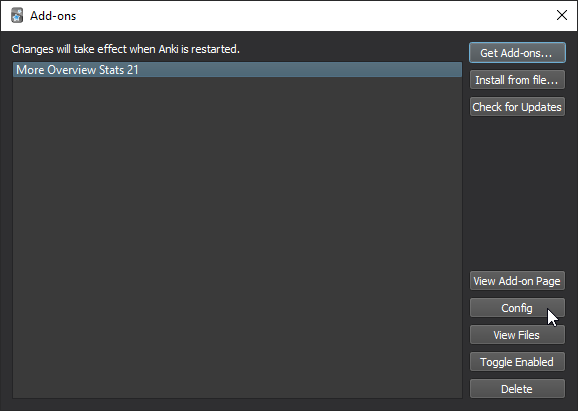 Note: If this option is greyed out, the config.json in the add-on folder is likely missing. In that case, simply create an empty text file in the add-on’s folder among the init.py, meta.json and More_Overview_Stats_2_1.py files and rename it to config.json. Make sure that the extension is .json and not .txt or .json.txt etc., otherwise Anki will not recognize the file. Restart Anki to reload the add-on.